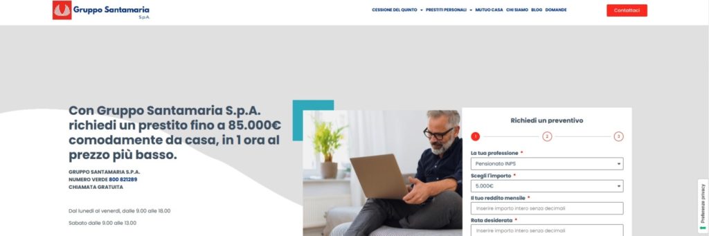 Gruppo Santamaria si occupa di cessione del quinto, finanziamenti e prestiti personali per la tua famiglia e mutui per la tua casa. Comodamente da casa tua puoi richiedere gratuitamente e senza impegno in 1 ora il preventivo per l’importo di cui hai bisogno. Consulenti esperti e professionisti del credito costantemente aggiornati sono a tua disposizione.