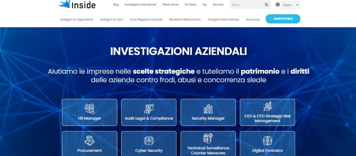 Inside è un’agenzia investigativa internazionale specializzata in investigazioni aziendali, che assiste imprese ed organizzazioni nella verifica dei rapporti con i propri partner commerciali ed impiegati attraverso indagini sui dipendenti, indagini su soci e concorrenza, indagini antifrode assicurativa, indagini informatiche, indagini sulla sicurezza aziendale.